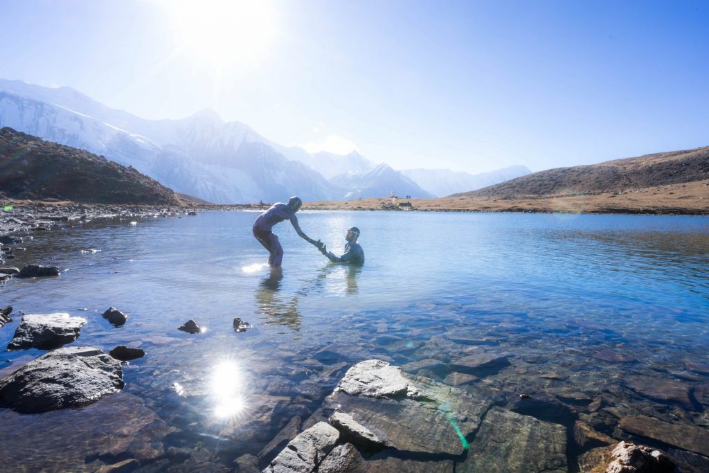 We made the longest STA freedive at the extreme altitude of around 4720m. With times 2:21(Lidija) and 3:28(Vitomir) they count as WR times. But it didn’t all start all shiny and peachy. Arriving at Manang made us feel lucky to be alive. Calling the way “road” would be definitely overusing the term, as this would much closer be described as UIAA class II route. We had a good vehicle, and after roughly 9 hours of bruising and motion sickness we first busted a cooler pipe, which we managed to patch…